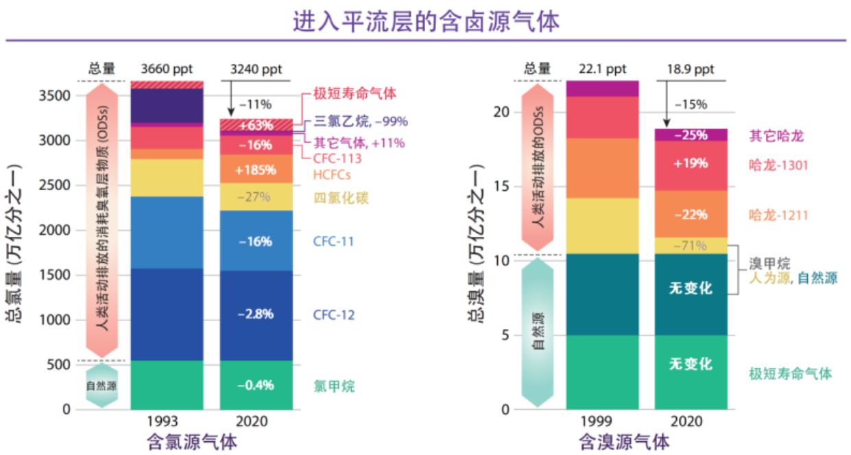 图1 大气中主要消耗臭氧层物质(含卤源气体)对平流层卤素贡献。来源:《臭氧损耗科学评估:2022》
